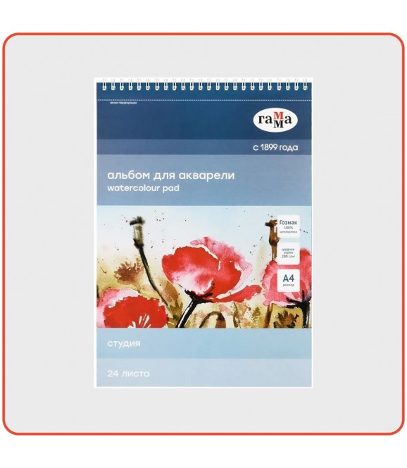 Альбом для акварели, 24 листа, А4, на спирали Гамма "Студия", 200г/м2, среднее зерно, перфорация на отрыв.